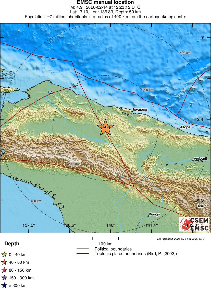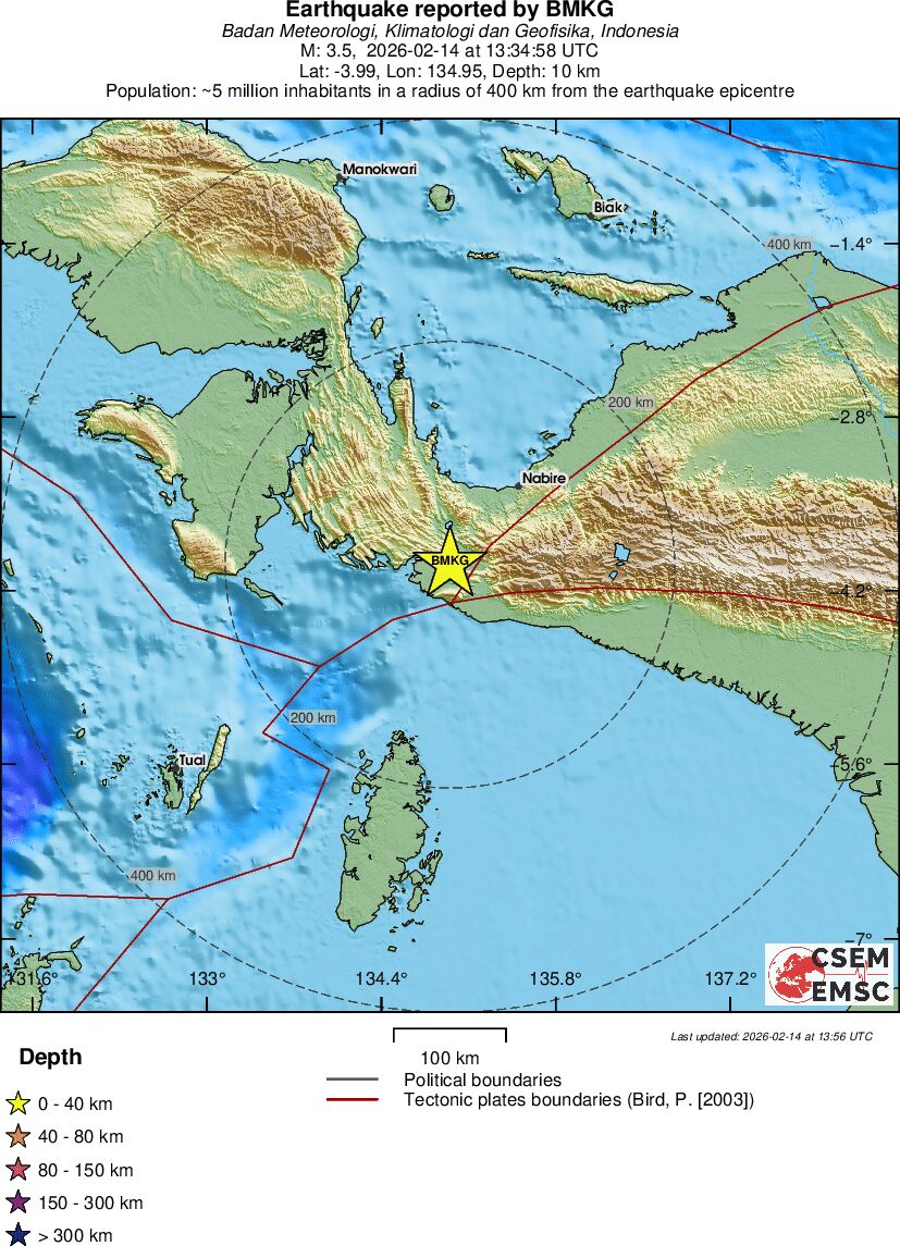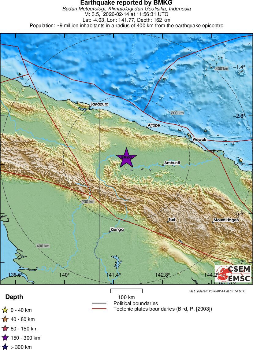 | 3.5 | 10 | 8175 | 13:34:58 | Link | Minor earthquake - PAPUA, INDONESIA - February 14, 2026 |