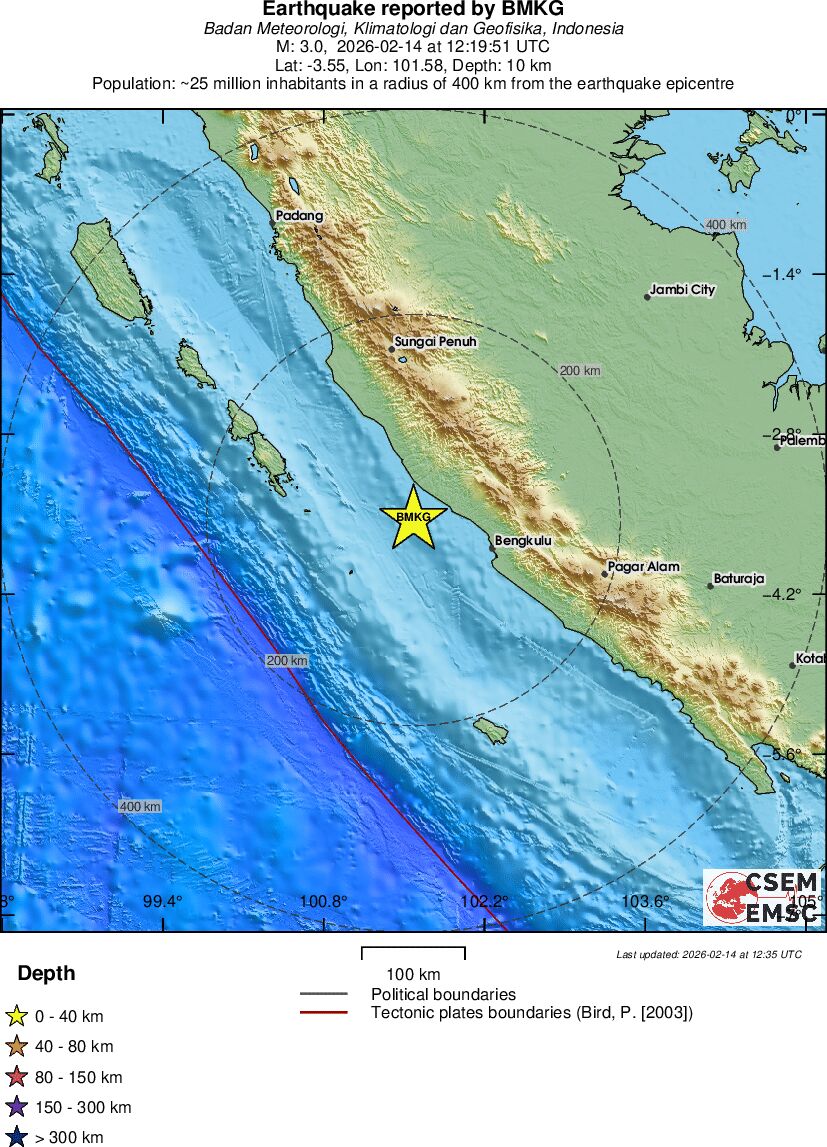 | 3.0 | 10 | 6992 | 12:19:51 | Link | Minor earthquake - SOUTHERN SUMATRA, INDONESIA - February 14, 2026 |