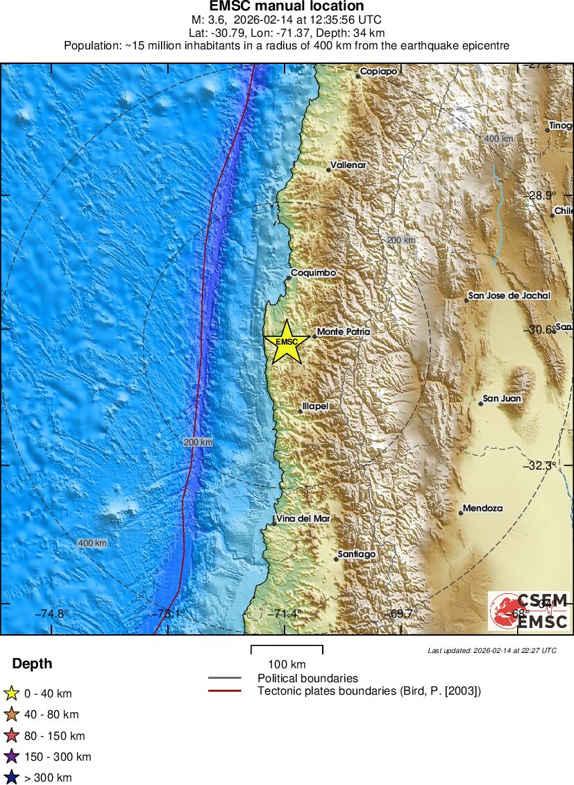 | 3.6 | 46 | 7197 | 12:35:55 | Link | Minor earthquake - COQUIMBO, CHILE - February 14, 2026 |