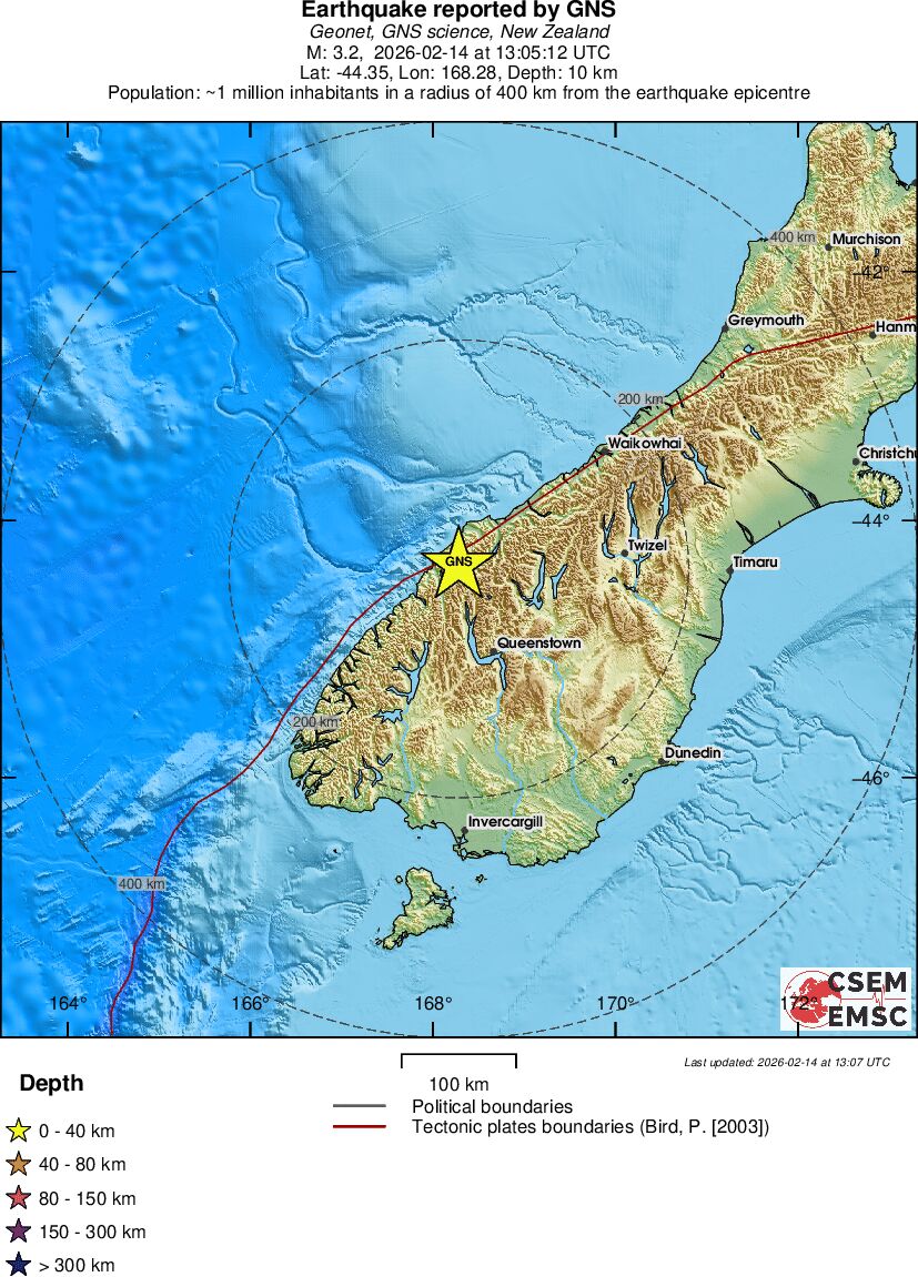 | 3.2 | 10 | 11556 | 13:05:12 | Link | Minor earthquake - SOUTH ISLAND OF NEW ZEALAND - February 14, 2026 |