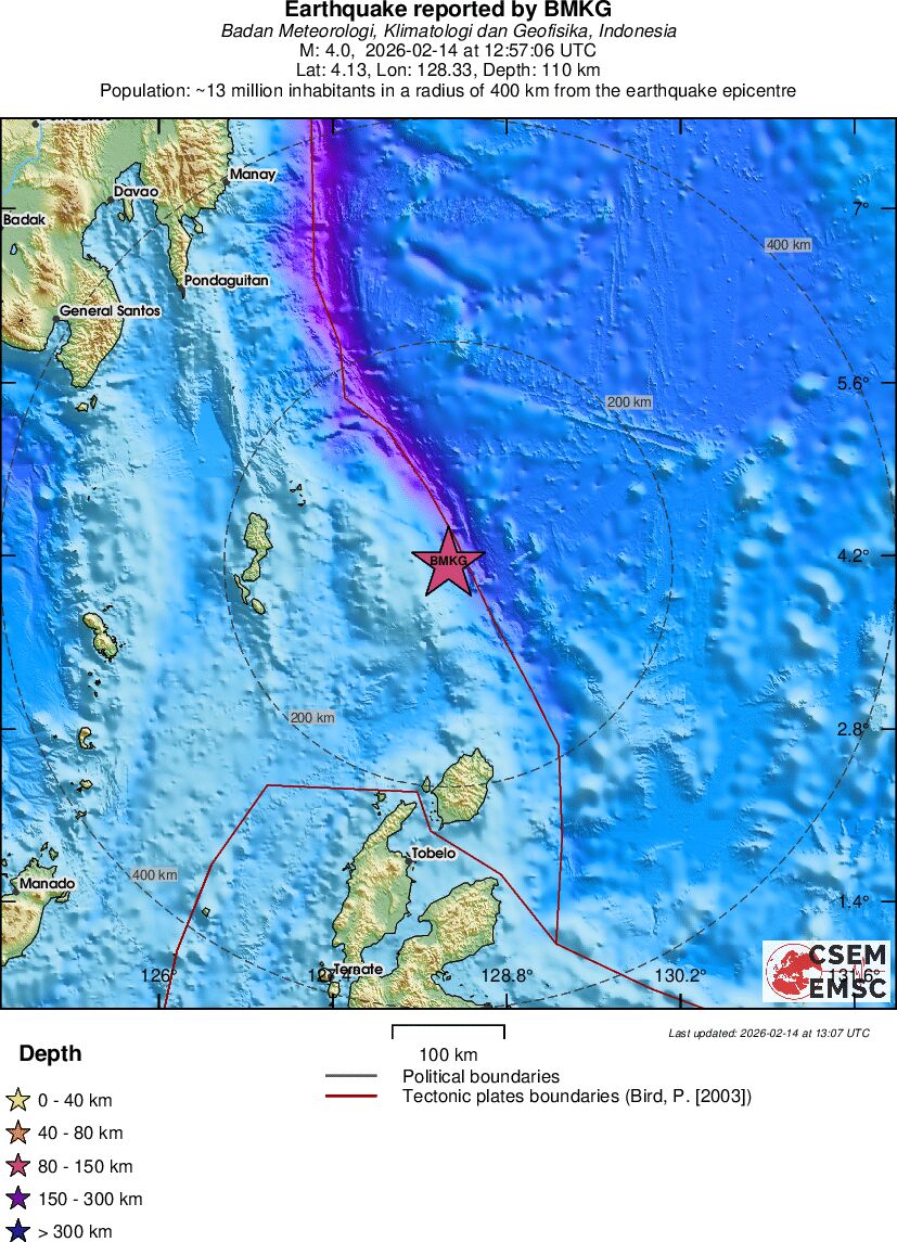| 4.0 | 110 | 7471 | 12:57:06 | Link | Light earthquake - NORTH OF HALMAHERA, INDONESIA - February 14, 2026 |