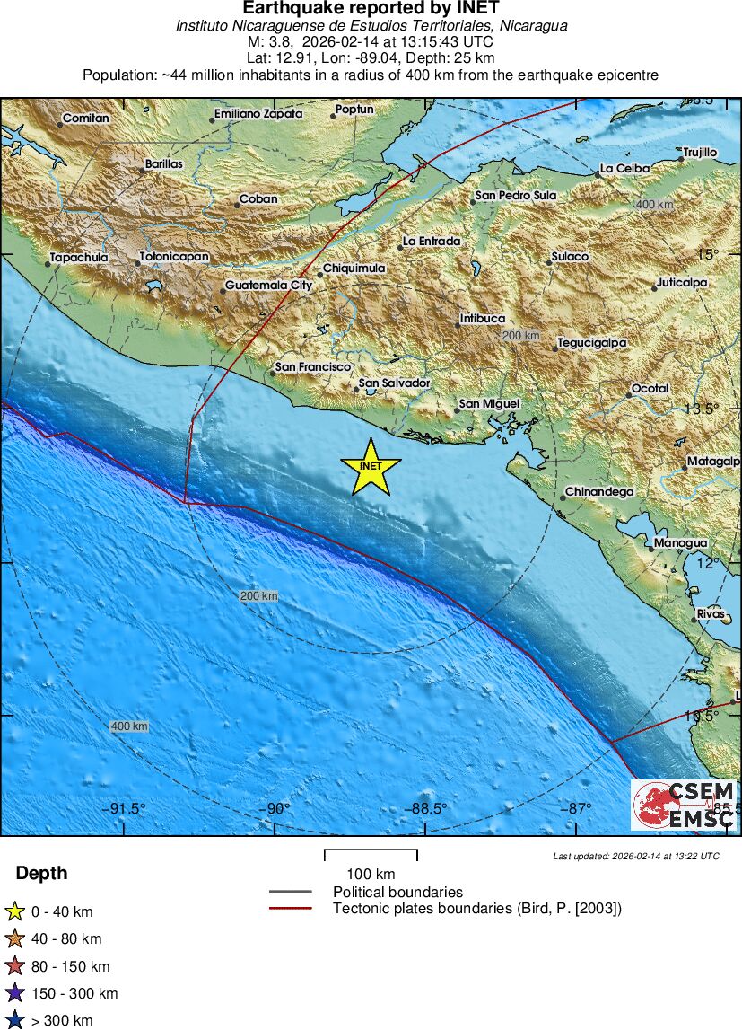 | 3.8 | 25 | 5321 | 13:15:43 | Link | Minor earthquake - OFFSHORE EL SALVADOR - February 14, 2026 |