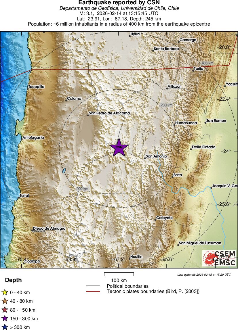 | 3.1 | 245 | 6657 | 13:15:45 | Link | Minor earthquake - SALTA, ARGENTINA - February 14, 2026 |