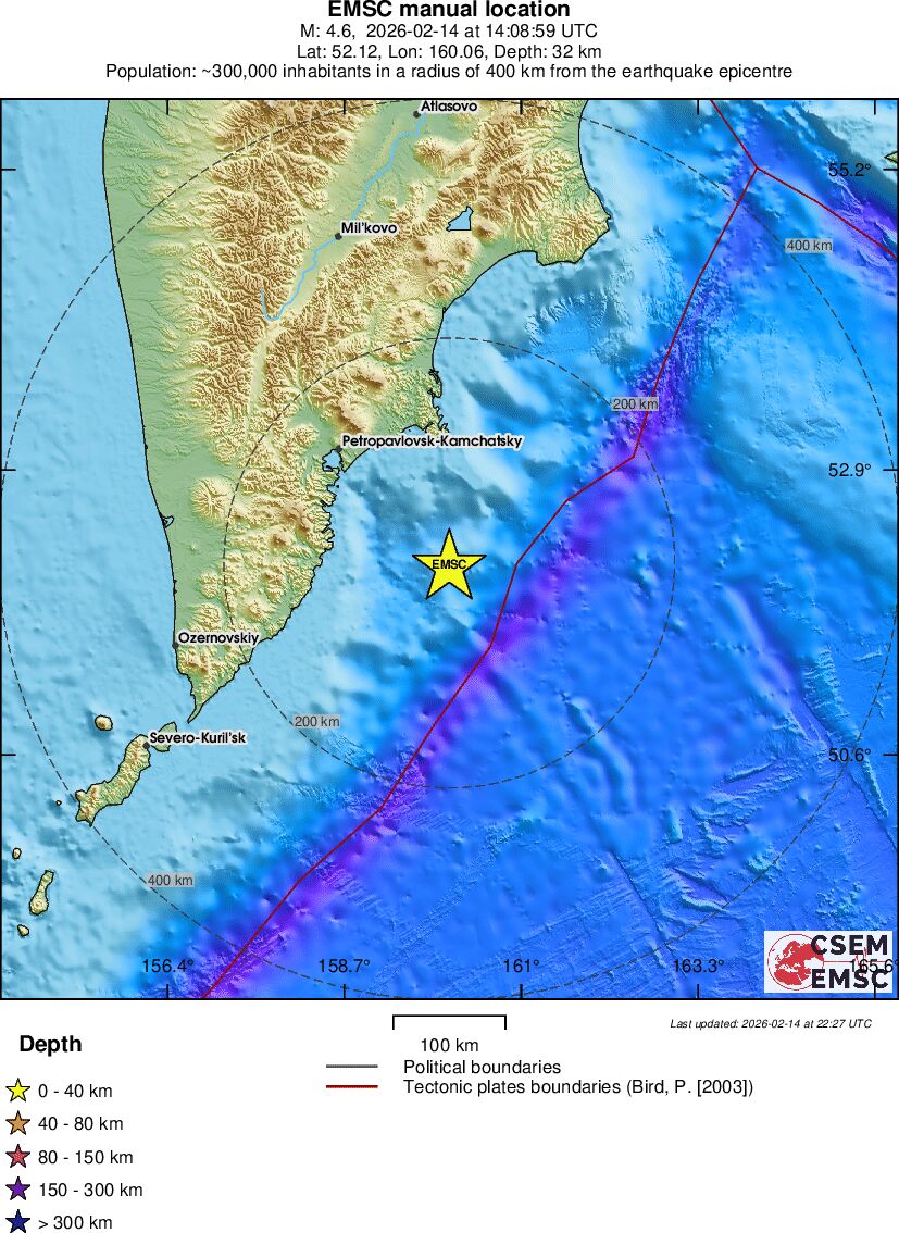 | 4.6 | 40 | 4919 | 14:08:57 | Link | Light earthquake - OFF EAST COAST OF KAMCHATKA - February 14, 2026 |
