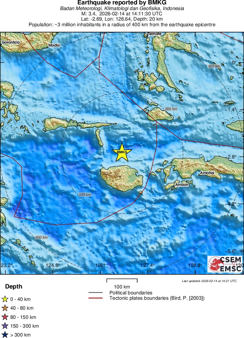 | 3.4 | 20 | 7837 | 14:11:30 | Link | Minor earthquake - CERAM SEA, INDONESIA - February 14, 2026 |