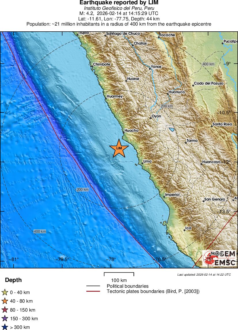 | 4.2 | 44 | 6299 | 14:15:29 | Link | Light earthquake - NEAR COAST OF CENTRAL PERU - February 14, 2026 |