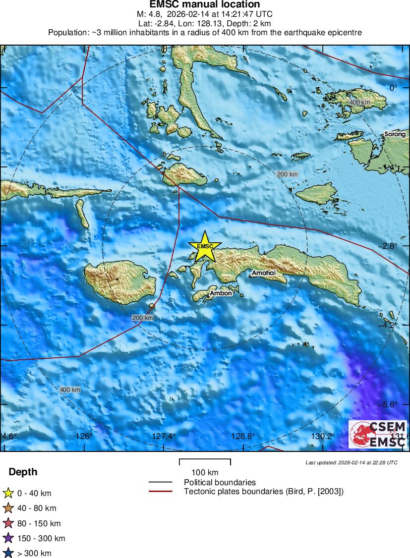 | 4.8 | 35 | 7897 | 14:21:52 | Link | Light earthquake - CERAM SEA, INDONESIA - February 14, 2026 |
