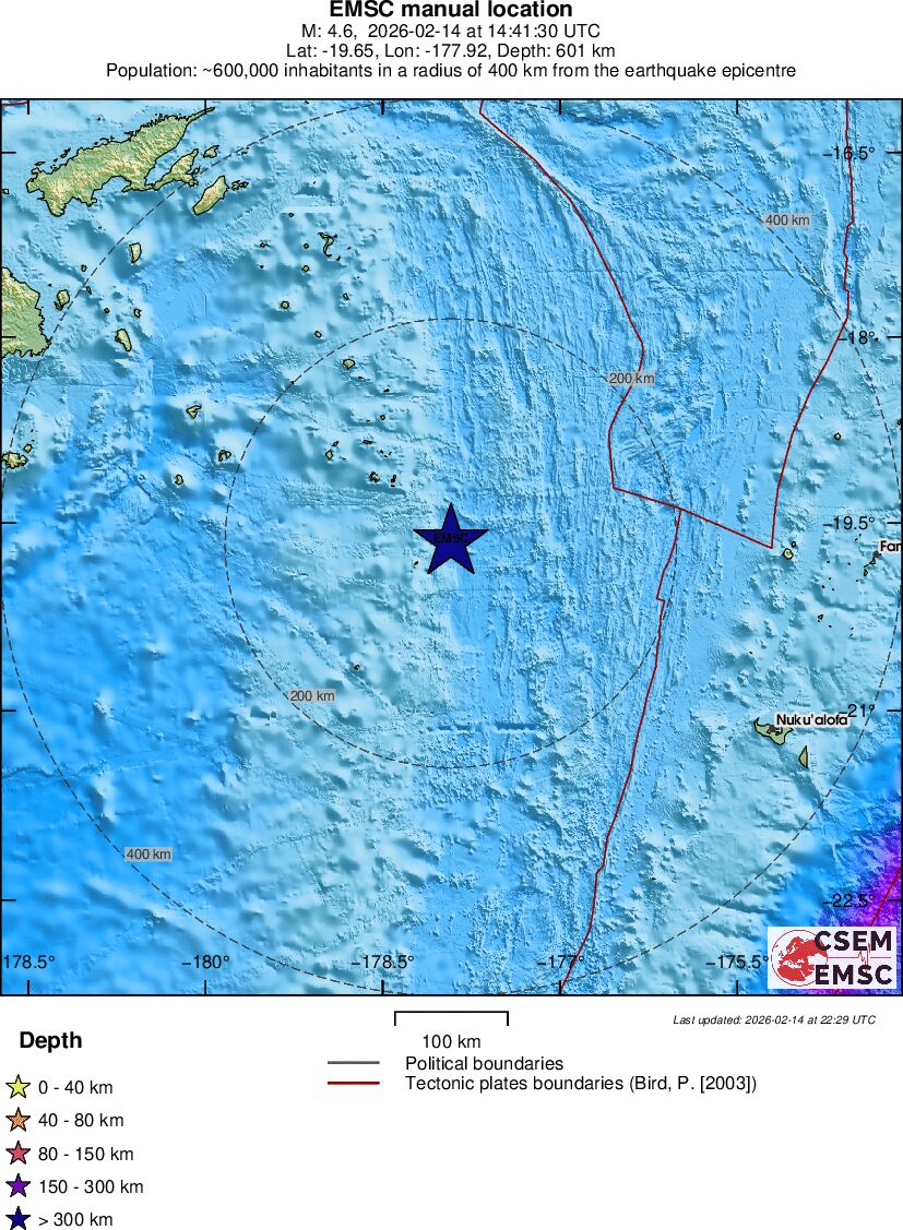 | 4.6 | 597 | 9921 | 15:03:15 | Link | Light earthquake - FIJI REGION - February 14, 2026 |