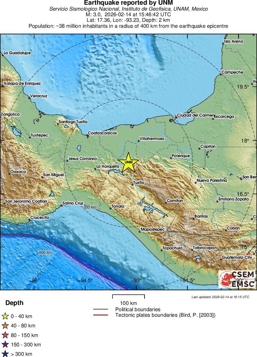 | 3.0 | 2 | 5231 | 15:46:42 | Link | Minor earthquake - CHIAPAS, MEXICO - February 14, 2026 |