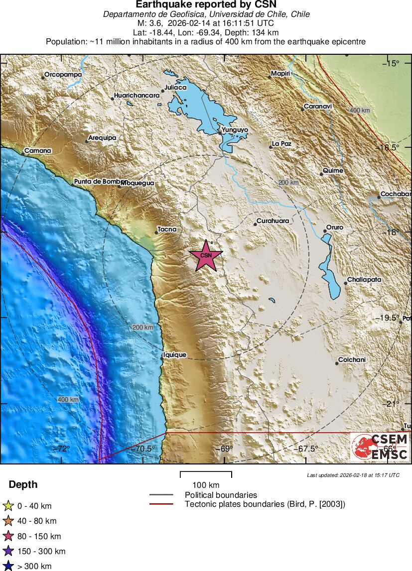 | 3.6 | 134 | 6403 | 16:11:51 | Link | Minor earthquake - TARAPACA, CHILE - February 14, 2026 |