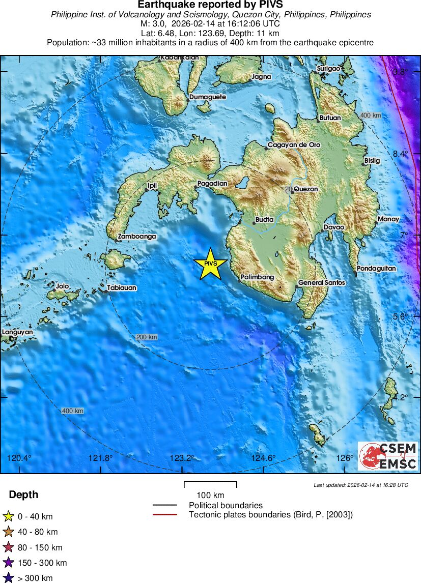 | 3.0 | 11 | 7182 | 16:12:06 | Link | Minor earthquake - MORO GULF, MINDANAO, PHILIPPINES - February 14, 2026 |
