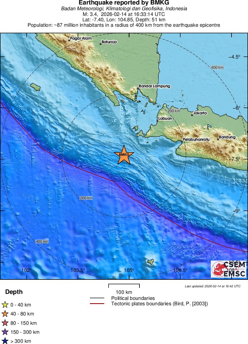 | 3.4 | 51 | 7338 | 16:33:14 | Link | Minor earthquake - SOUTHWEST OF SUMATRA, INDONESIA - February 14, 2026 |
