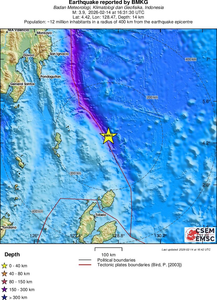 | 4.0 | 14 | 7457 | 16:31:30 | Link | Light earthquake - NORTH OF HALMAHERA, INDONESIA - February 14, 2026 |