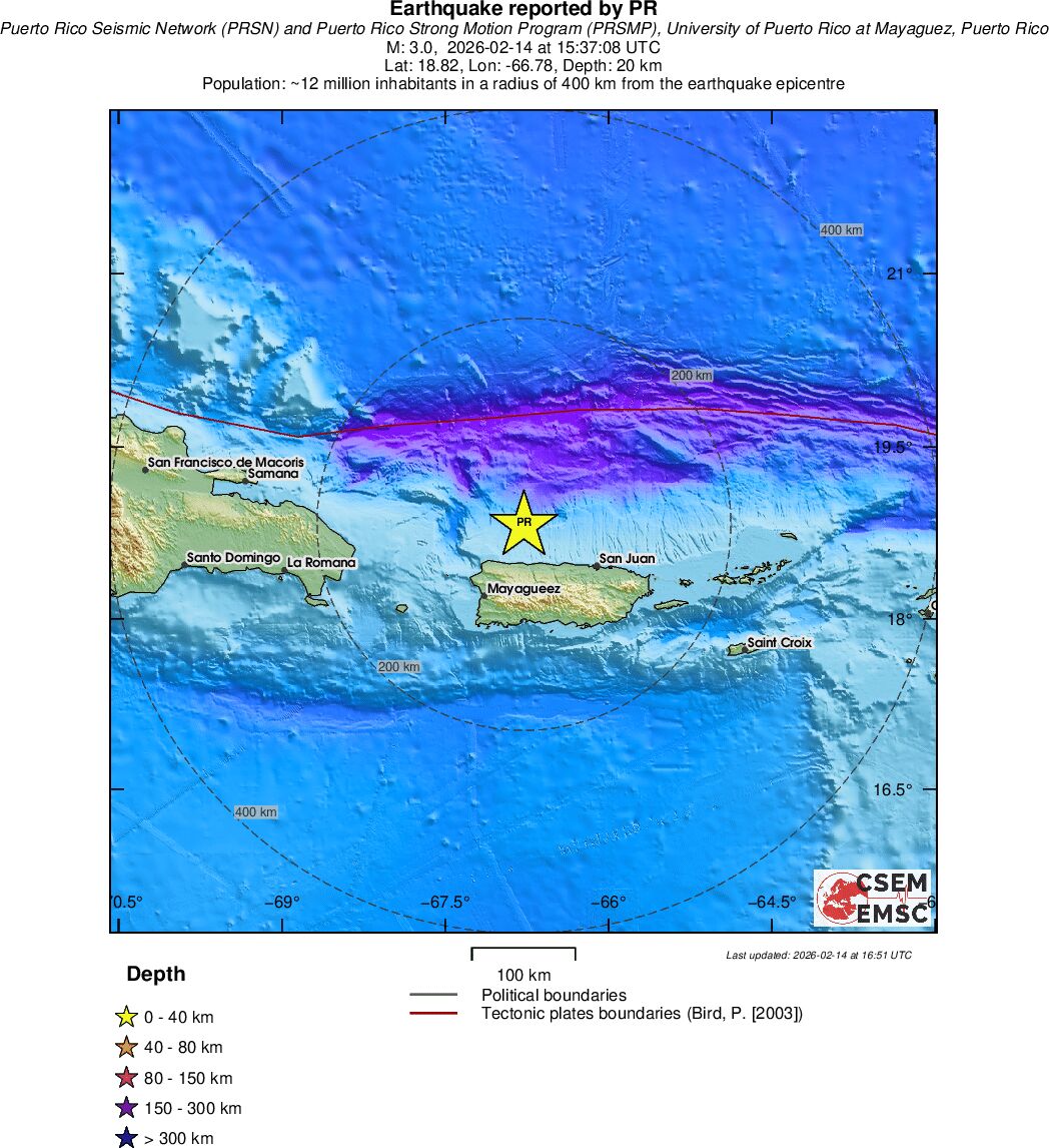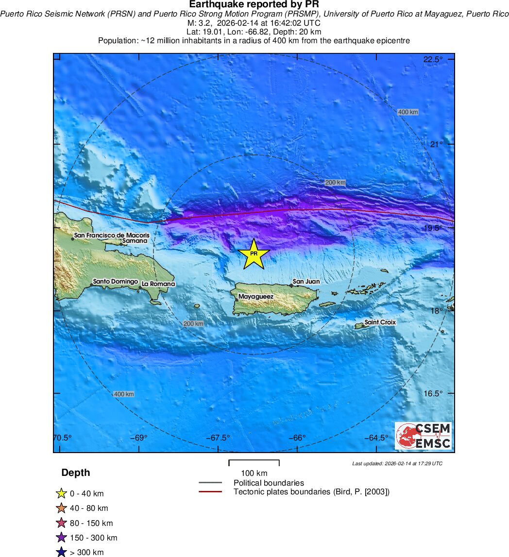 | 3.1 | 20 | 4132 | 15:30:17 | Link | Minor earthquake - PUERTO RICO REGION - February 14, 2026 |