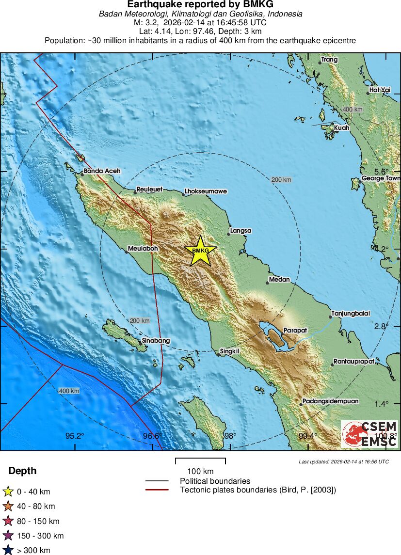 | 3.2 | 3 | 6391 | 16:45:58 | Link | Minor earthquake - NORTHERN SUMATRA, INDONESIA - February 14, 2026 |