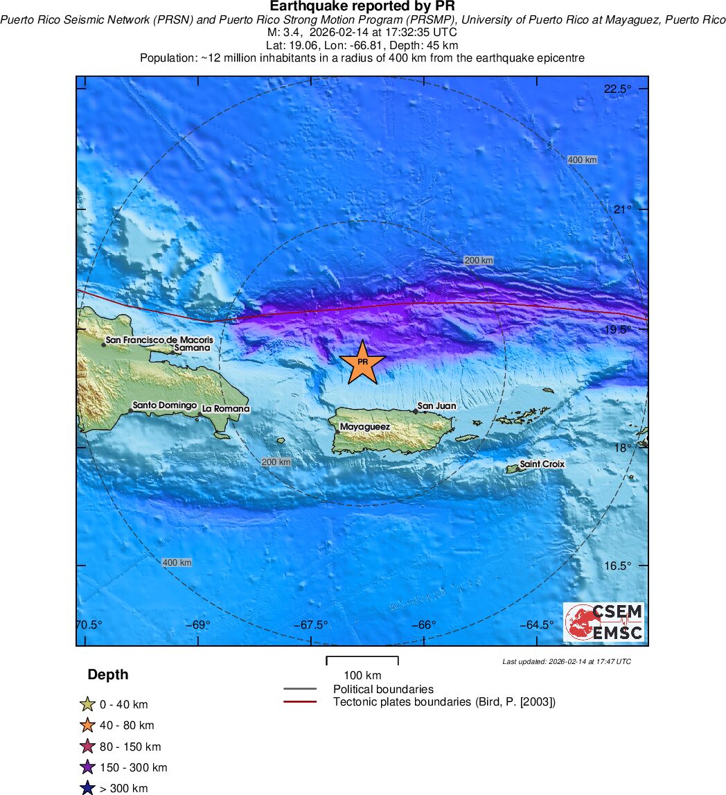 | 3.4 | 45 | 4118 | 17:32:35 | Link | Minor earthquake - PUERTO RICO REGION - February 14, 2026 |