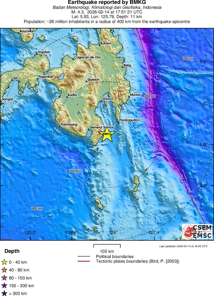 | 4.3 | 11 | 7282 | 17:51:31 | Link | Light earthquake - MINDANAO, PHILIPPINES - February 14, 2026 |