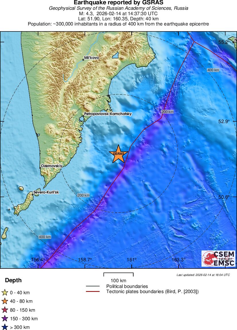 | 4.3 | 40 | 4930 | 14:37:30 | Link | Light earthquake - OFF EAST COAST OF KAMCHATKA - February 14, 2026 |